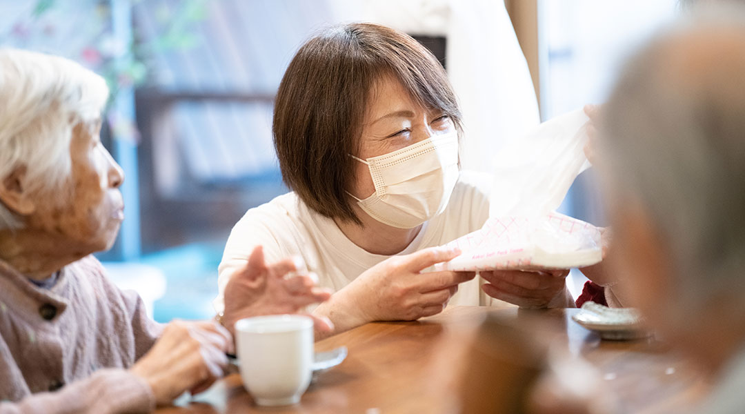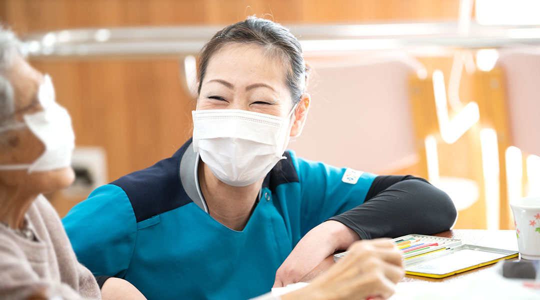 私たちと一緒に働いてくださる仲間を募集中です。ここでは看護師もケアワーカーも事務スタッフもみんな同じ制服を着用し、若手からベテランまで業種の壁を超えて業務を助け合い楽しく働いています。