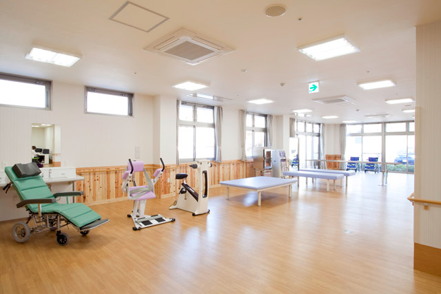 白を基調とした内装で広々としたゆとりのある空間です。リハビリマシンがずらりと並んでいて利用者様も積極的に活用しています。