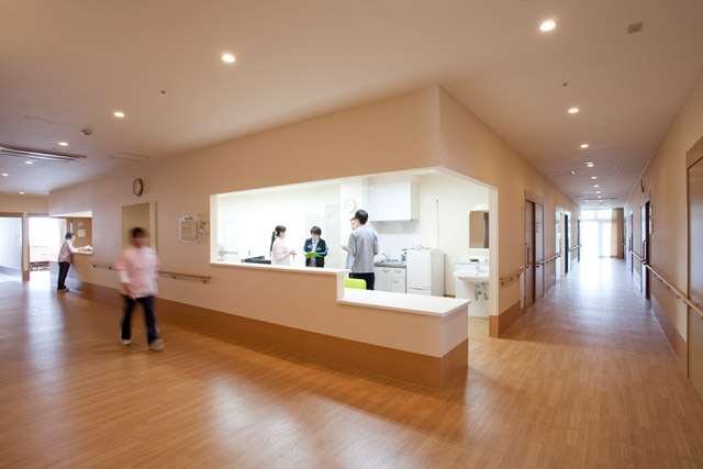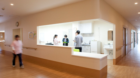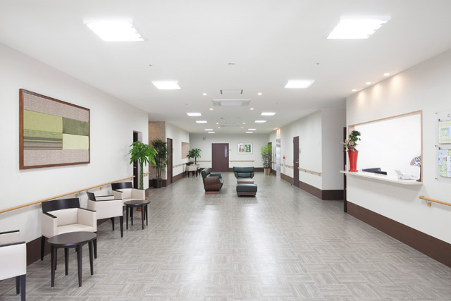 2階のサービスステーションには、24時間スタッフが常駐。また、施設内には中庭もあり、楽しく安心して過ごしていただける充実の設備を揃えています。